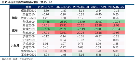 观察主要品种期货升贴水率。贴水率高的行业市场远期定价悲观,易跌破成本线,更可能触发反内卷政策,政策出台后基差修复空间也更大。观察本周反内卷关注度高的板块,其主力期货合约均有不同程度贴水。