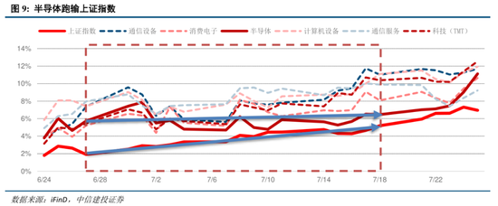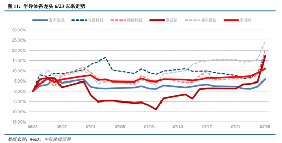 半导体在酝酿后爆发,关注未来可能的补涨行情。7月25日,半导体板块爆发,逆大盘领涨,涨幅+1.93%。寒武纪最高涨幅达到+16.12%,其他细分领域龙头如翱捷科技(无线通信芯片)、盛科通信(以太网交换芯片)、恒玄科技(音频SoC)、气派科技(封装)也均大幅上涨。