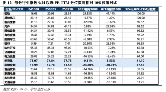 横向对比行业,半导体、非银金融在前期的估值分位相当低,在指数突破创新高的背景下补涨空间较为充分。半导体在7月18日(异动前)的PE-TTM分位仅是924以来的41.1%,非银金融的PE-TTM分位则是37.56%,相较近期强趋势板块如医药、有色、钢铁、军工等,估值都几乎来到924以来的最高位,仍有较大空间。