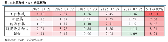 分行业来看本周涨幅前五板块,工程机械与钢铁板块爆发集中在周一至周二,动因来自雅江工程开工;其他三个与反内卷进程相关:本周煤炭板块受煤矿生产核查通知影响,反内卷信号加强,迎来暴涨;能源金属与小金属板块爆发,多个锂矿股涨停,主要由于国家专项打击战略矿产走私,严防绕道出口,利好稀土、锂资源合规企业。