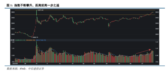 “上台阶”行情继续演绎,A股市场情绪高涨。我们前期提出A股“上台阶”逻辑继续演绎,近期关注三方面动向:一是大盘突破3600点,情绪指数突破90进入亢奋区,二是证监会表态“全力巩固市场回稳向好态势”继续力挺市场走牛,三是赚钱效应下融资买入,新基金发行指标上行,这都表明在高涨的市场情绪下,增量资金有望加速流入。同时,换手率、超60MA、超买超卖等指标都显示当前市场存在技术性调整需求,我们认为在增量资金流入背景下调整幅度可能较为有限。短期看市场可能表现为高位震荡和随后加速冲顶,往后看警惕情绪进一步上升后反转风险。