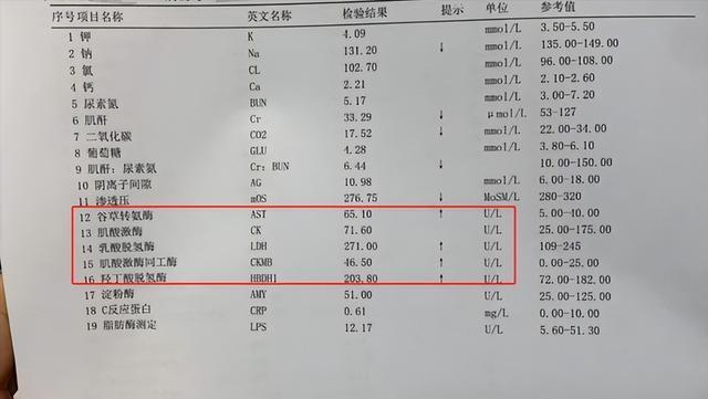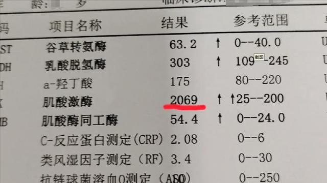 肌酸激酶是肌肉细胞里的一种酶,一旦肌肉细胞被破坏,它就会大量释放到血液里,抽血就能查出来,正常值一般不超过190U/L。